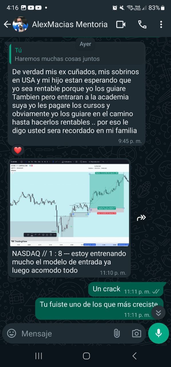 ¡Tengo una comunidad exclusiva la cual puedes ser parte! Yo personalmente, te voy ayudar en la mentoría 1 a 1 o bien, pueder ser parte del team avanzado y operar en lives en conjunto. Garantizamos el éxito si cumples exactamente nuestro plan.